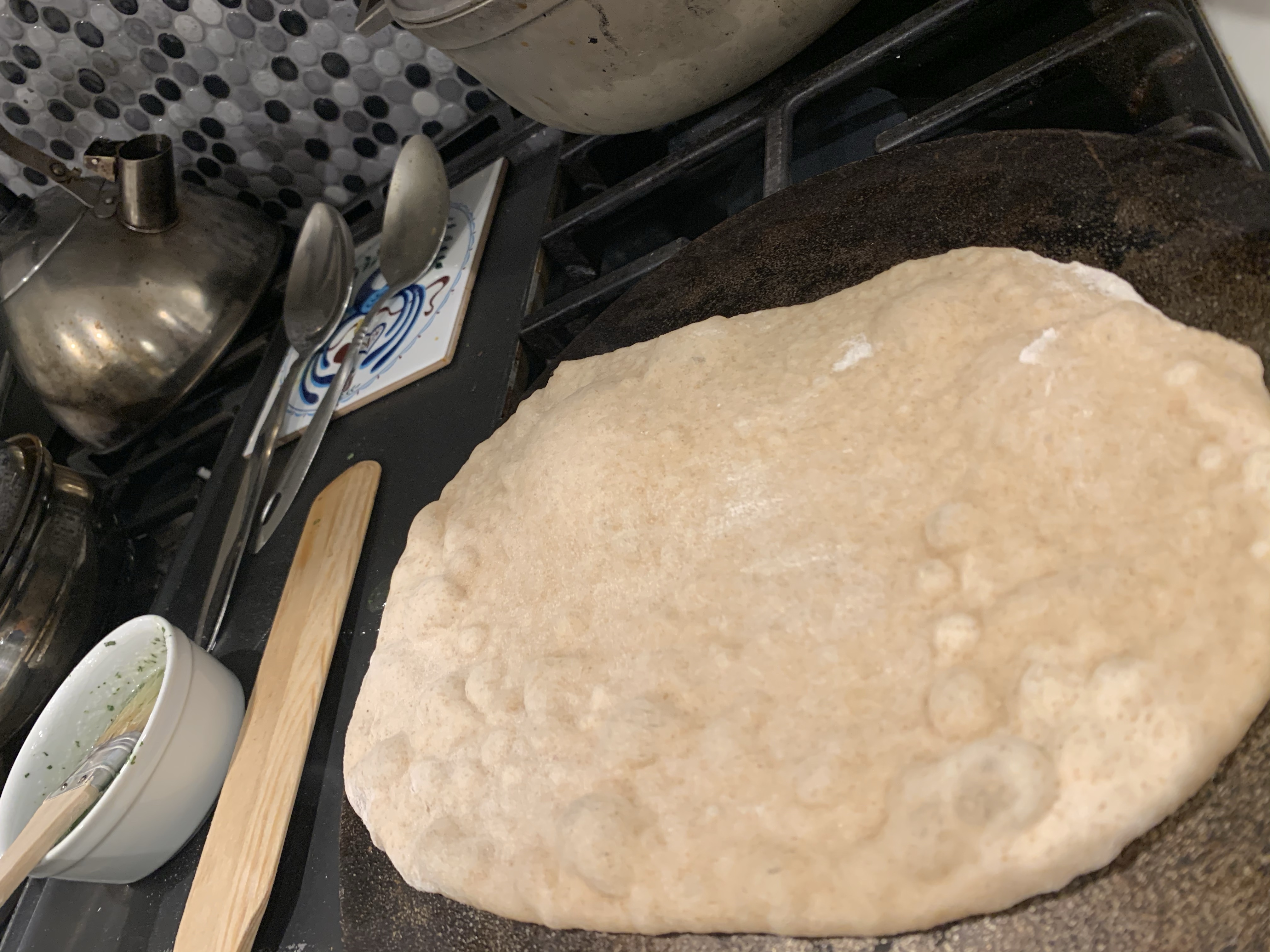 Mix the yeast and sugar with 1/4 cup of the water. Let the yeast bloom for about five minutes. Meanwhile sift the flour and salt, set aside. Add the yogurt and the remaining water to the yeast (after it has bloomed). Mix those ingredients and then add in the flour. Using a mixer with the dough hook, on a low setting mix to a sticky ball of dough forms. On a lightly floured surface need the dough for five minutes, don’t add to much flour while kneading. Oil a bowl with 1 tablespoon of olive oil, add the dough and cover. Let the dough rest for two hours or has doubled in size. In a little pot on the lowest heat setting place the butter and the remaining olive oil with the garlic, bring to a simmer. Turn off the heat and let it cool to room temperature. Then add the butter oil mixture to the cilantro, set aside for later. Place a heavy bottom pan on medium heat. Divided the dough ( after it has risen) into six equal parts. Roll the dough ( on a lightly floured surface) out into circular or oblong shapes, about 1/4 inch thick. Cook the naan for about 1 1/2 minutes ( or till blisters form) then flip and cook for about a minute more. Then place the naan directly on the fire for a few seconds turning. Brush the naan with the oil butter mixture. Repeat with the remaining dough pieces. Enjoy!