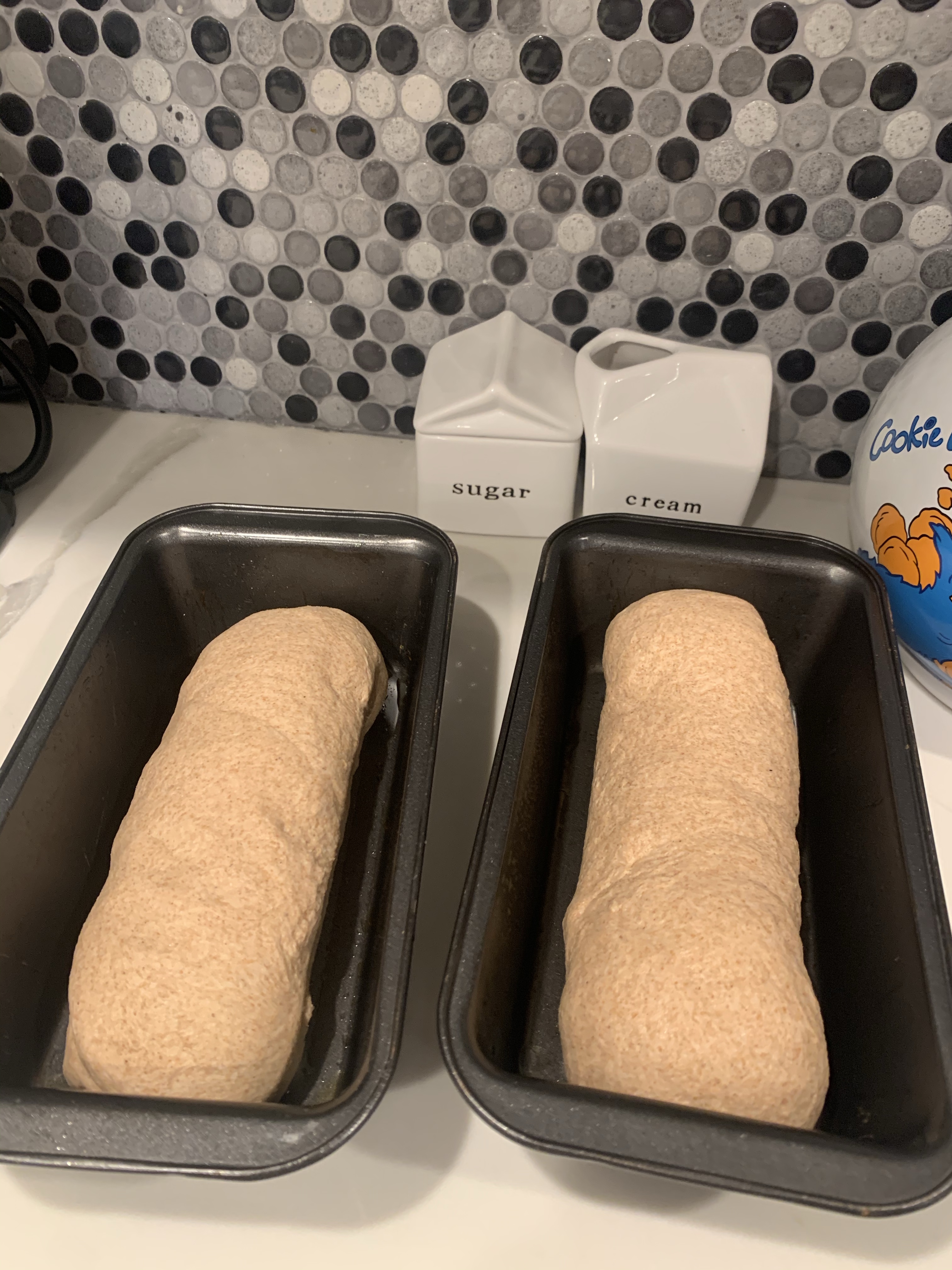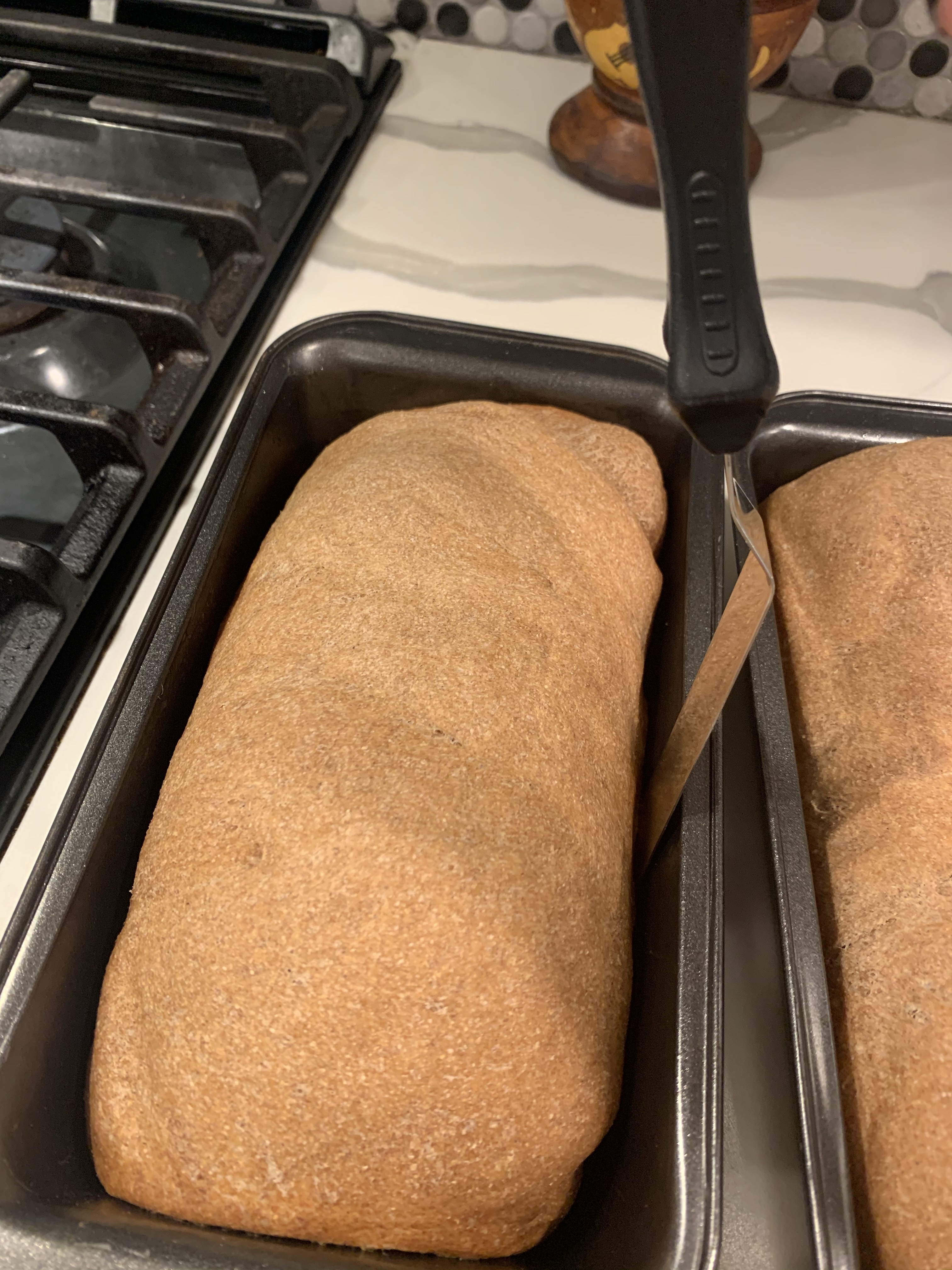 First sift the 5 cups of whole wheat flour and salt in a small bowl and set aside. In a larger bowl ( I used my KitchenAid bowl); mix the yeast, honey and half a cup of the water. Let the yeast poof for about 10 minutes. The yeast will start to foam as it’s activated. Incorporate the flour into the yeast with the remaining water. Using the dough attachment, mix for about a minute or two till a sticky ball forms. On a floured surface with the half cup of flour start to knead the dough for about 15 minutes ( use the flour as needed). Knead the dough till it’s soft and enough gluten has developed. In light oiled bowl cover the dough and set aside for about two hours, or till it has doubled in size. After the dough has rested roll it out and divide it into 2 equal pieces. Roll each piece to a rectangular shape about ( 5”x10”). Then roll the dough from the smaller side, and tuck the ends into the bottom. Then place the dough in a lightly greased loaf pan. Do the same to the remaining dough. Let the dough rise again for at least an hour or 2. Preheat the oven to 350 F. When the oven is ready place two cups of water in a pan on the top shelf of the oven and place the bread in the oven on the lower shelf. Bake for about 40 minutes, or until a hallow sound is heard when knocked on. Let the dough rest for about 15-20 minutes before taking the loaf out of pan. Then lightly brush the tops with the melted butter. This bread can store in a refrigerator for a week. Enjoy!!
